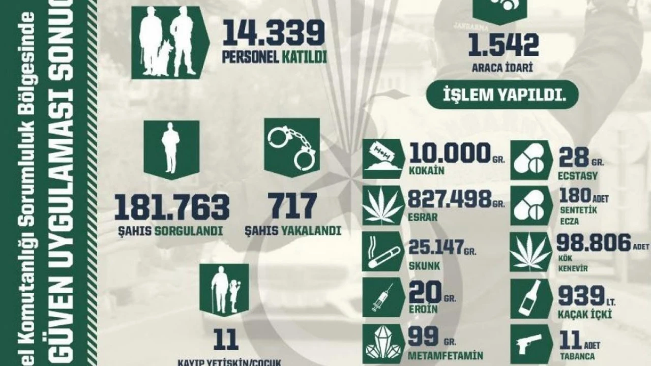 Bin 542 araçla ilgili idari işlem yapılan uygulamada ayrıca 10 kilogram kokain, 827 bin 498 gram esrar, 25 bin 147 gram skunk, 20 gram eroin, 99 gram metamfetamin, 1.9 kilogram sentetik kannabionid, 28 gram ecstasy, 180 adet sentetik ecza, 98 bin 806 adet kök kenevir, 939 litre kaçak alkollü içki, 11 tabanca, 30 av tüfeği, 17 şarjör ve 867 adet mermi-fişek ele geçirildi.