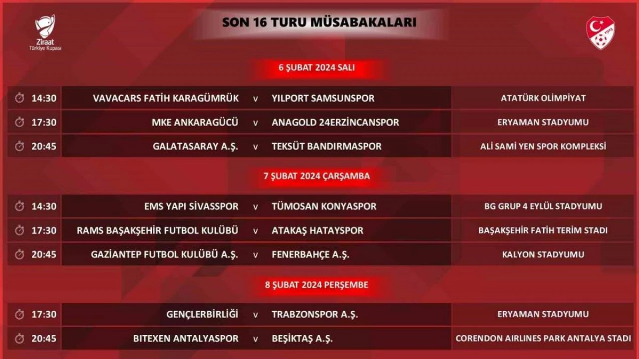 Türkiye Futbol Federasyonu, Ziraat Türkiye Kupası Son 16 Turu’nun programını duyurdu. TFF’nin resmi internet sitesinden yapılan açıklamaya göre Türkiye Kupası’nda son 16 turu karşılaşma programı şu şekilde: