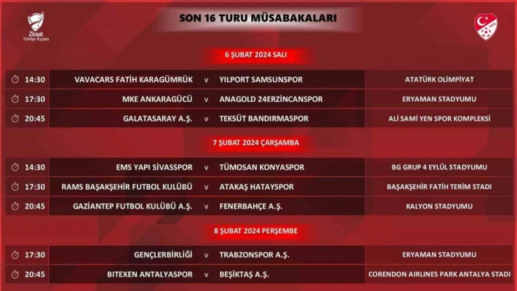 Ziraat Türkiye Kupası’nda son 16 turu maçlarının programı belli oldu.
