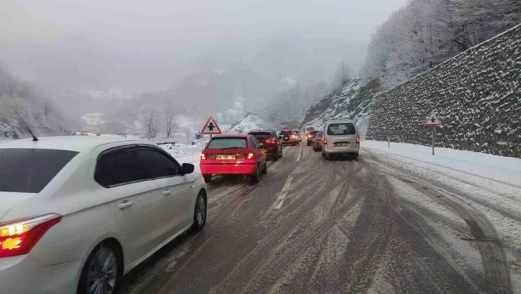 Zonguldak’ta kar yağışı etkili olurken, Zonguldak-İstanbul ve Zonguldak-Ankara karayolu üzerinde uzun araç kuyrukları oluştu.