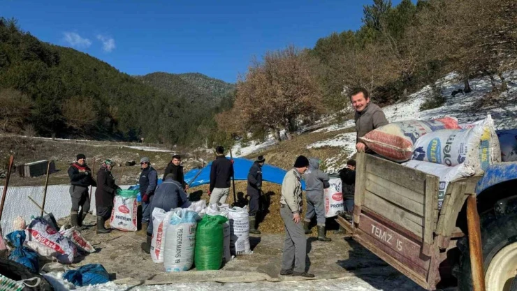 Zorlu kış şartlarında imece usulüyle hayvanlarını besliyorlar